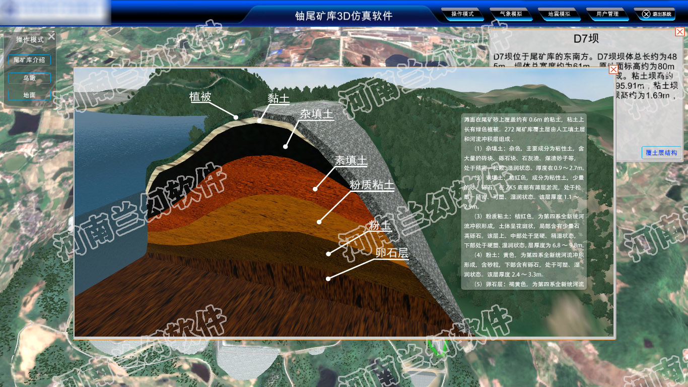 尾礦災害治理項目是環境保護類工程,隨著環境保護力度的不斷加大,災害治理項目紛紛上馬,為了說明災害治理項目的歷史、危害、治理方案,并且能夠直觀可視化的方式展示出來。我司承接了某尾礦庫三維虛擬仿真項目。
