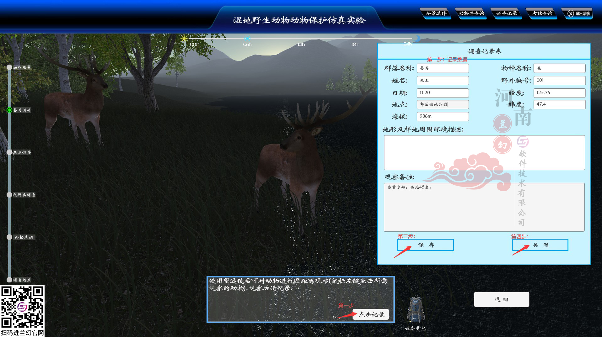野生動物動物保護(hù)仿真實(shí)訓(xùn)軟件利用虛擬環(huán)境方法,采用樣線法、樣方法學(xué)習(xí)植物種類,種類、生長地、生活型、頻度、高度、蓋度等特征,分析濕地植物結(jié)構(gòu)變化,了解植物發(fā)育規(guī)律利用虛擬環(huán)境樣,對環(huán)境脊椎動物、無脊椎動物樣線法、樣點(diǎn)法和直接計(jì)數(shù)法進(jìn)行調(diào)查,對集群繁殖或棲息的鳥類調(diào)查使用直接計(jì)數(shù)法進(jìn)行調(diào)查,記錄動物或活動痕跡所在地的坐標(biāo)、地貌、海拔、坡度、坡位、坡向、植被類型等棲息地因子,了解動物的生活史,以及各調(diào)查樣區(qū)野生動物及棲息地受到的主要威脅、受干擾狀況及程度。