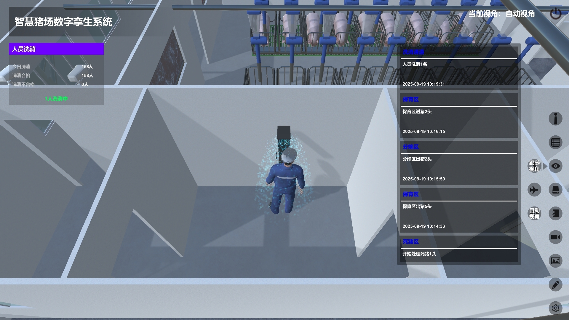 中控系統(tǒng)包含對(duì)人員消洗、人員巡舍、母豬轉(zhuǎn)舍、小豬轉(zhuǎn)舍、死豬流程、賣豬流程三維動(dòng)畫(huà)演示及對(duì)配懷區(qū)、分娩區(qū)、保育區(qū)處設(shè)備(風(fēng)機(jī)、水簾、溫度……)管控。