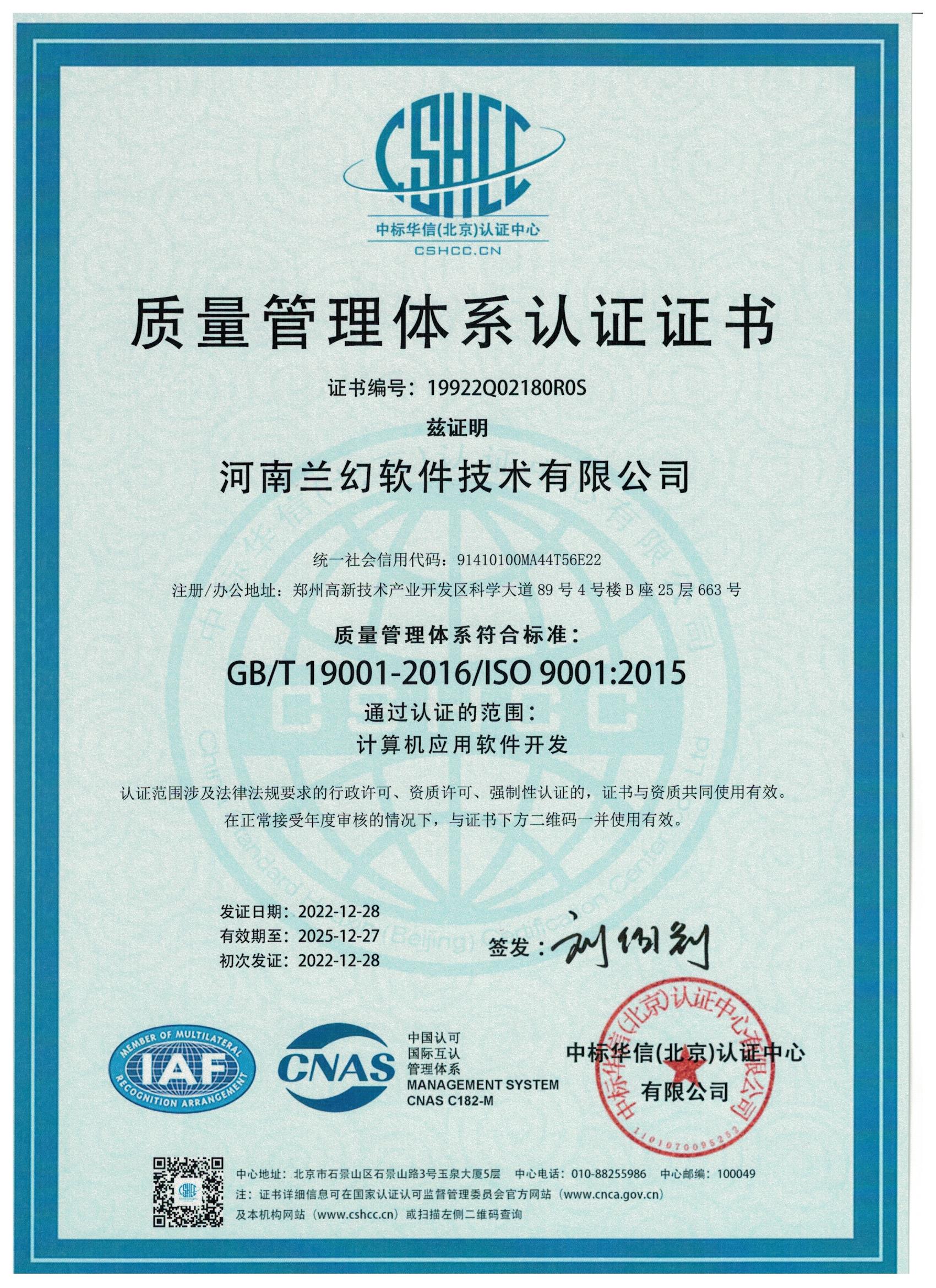2019年獲得河南軟件協會"雙軟"認證、ISO9001質量管理體系認證、 知識產權管理體系認證。